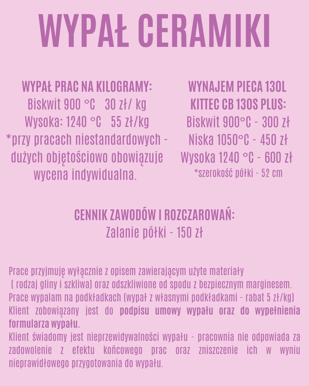 Klient zobowiązany jest do podpisania umowy przy oddaniu prac na wypał oraz do uzupełnienia formularza wypału. Poniżej cennik. Czas wypału podawany jest przy przyjęciu prac – jest on zależny od ilości prac, które są wypalane. Pracownia zastrzega sobie prawo do nieprzyjęcia prac w okresach dużego natężenia pracy – np. okres przedświąteczny. Zawieszenie usług, w takiej sytuacji będzie ogłoszone na stronie www i na mediach społecznościowych.